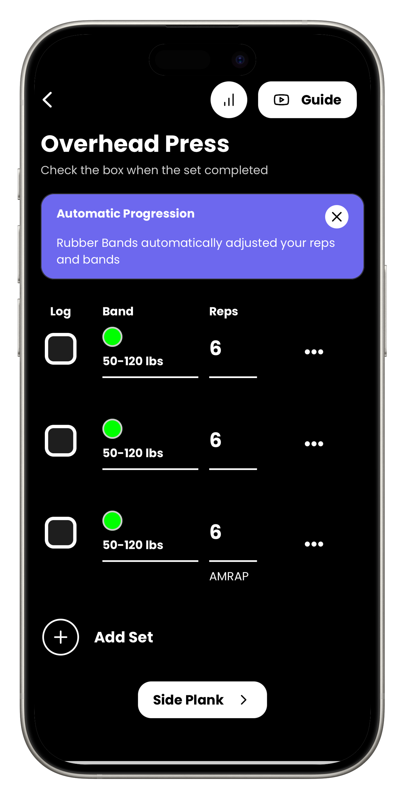 Progressive overload is the fundamental principle behind building strength and muscle: to continue making gains, you must gradually increase the demands placed on your body. In version 2.11.0 of Rubber Bands, an intelligent, automatic progressive overload system that adapts to your performance and guides you toward continuous improvement was introduced. This feature is available when your Rep Scheme is set to Guided